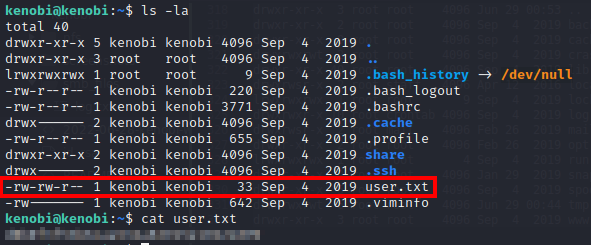 -rw-rw-r-- 1 kenobi kenobi 33 Sep 4 2019 user.txt